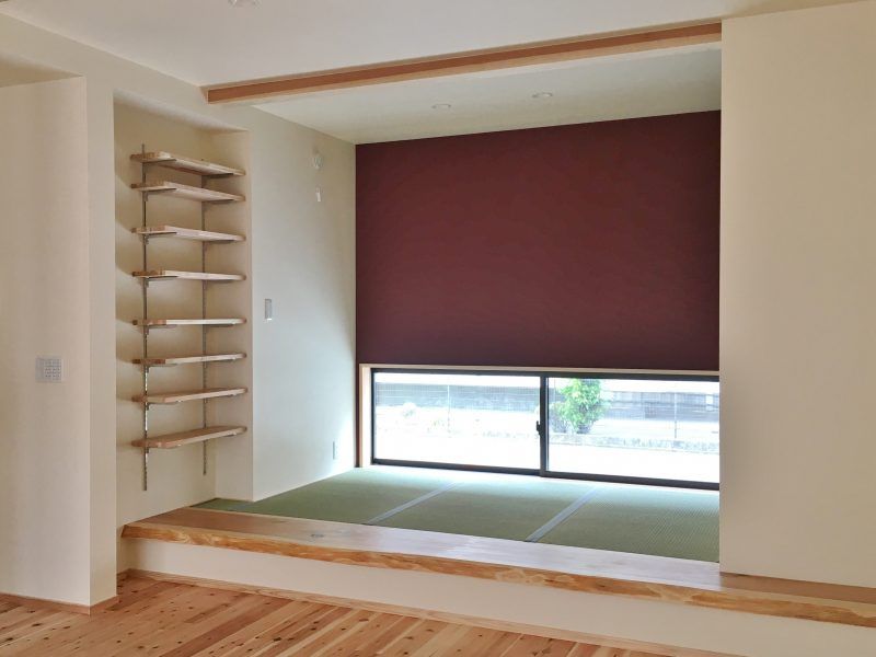 畳コーナーの印象的なえんじ色のアクセントクロス(壁紙)。