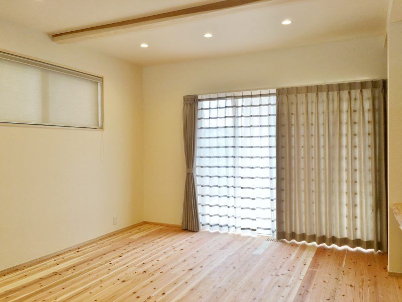 一続きのLDKにはこのアクセントクロスを際立たせるナチュラルなカラーのシンプルなカーテンを