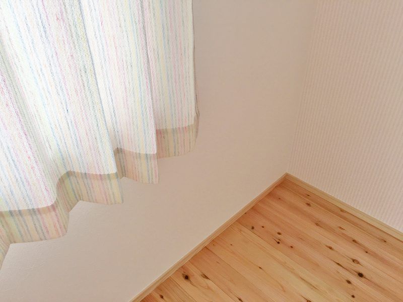 ピンク色のクロスがかわいらしい子供部屋には優しい風合いのストライプ柄のカーテンを。